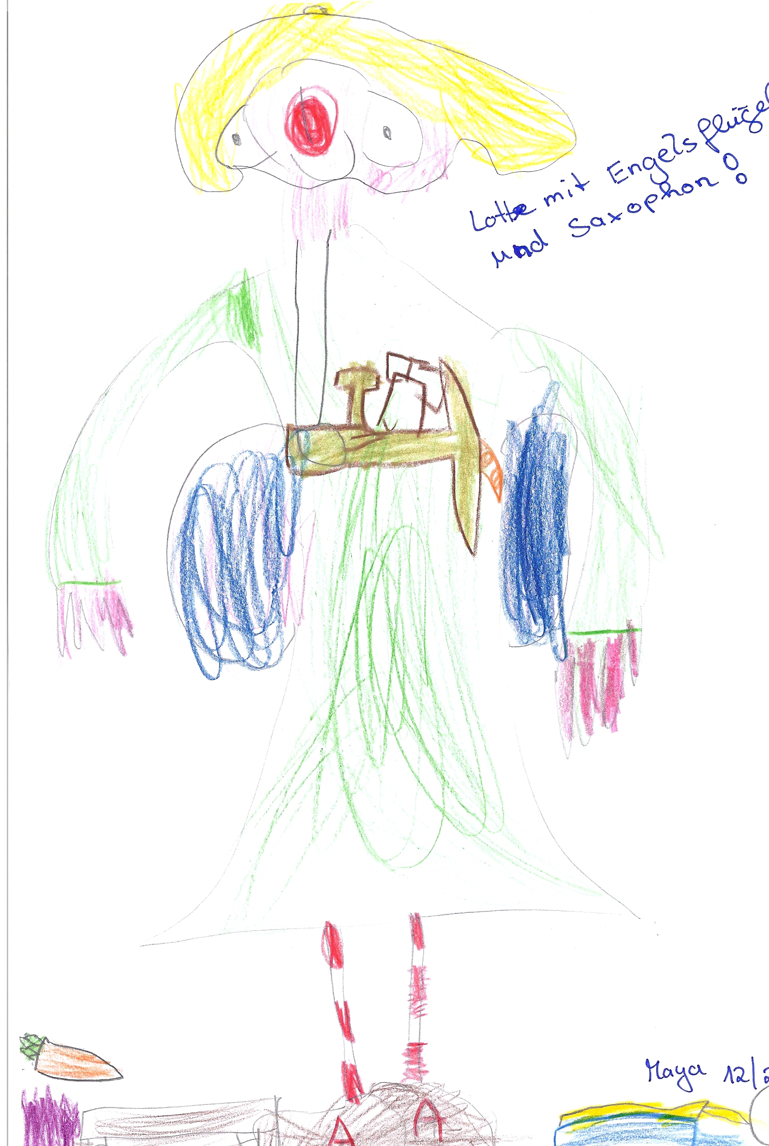 Ein Mädchen steht vor Lotte: „Hallo Clown, wer bist du?“ (sie staunt + guckt) – „LOTTE… (Pause)…und du?“ – „Paula! (sie schaut +überlegt lange)… – Du, Lotte?“ – „Hmm?“ – „Warum spielst du so toll Musihik?“ – „Weil es sooo viel Spaß macht!“ – (sie strahlt + läuft schnell weg).
